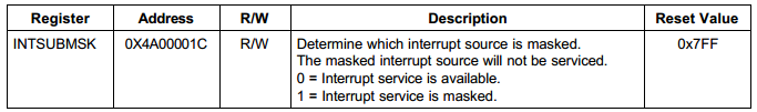 第139~145行,向INMSK和INTSUBMSK寄存器相应为位写1,屏蔽中断源