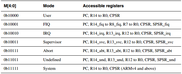 cpsr是32位寄存器,寄存器[31:28]位为状态标志位,[27:8]位保留未被使用,[7:0]位为控制位。控制位中的第7位和第6位是用来设置是否使能中断请求和快速中断请求,第5位是设置CPU操作状态,当设置为1处理器执行在Thumb状态,为0时执行在ARM状态,第0~4位一起用来决定CPU的工作模式,模式位具体说明如下图所示: