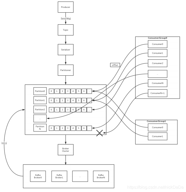中间服务。每个broker代表一个kafka服务,多个broker组成kafka集群。broker接收来自生产者的消息,为消息设置偏移量,并提交消息到磁盘保存。broker为消费者提供服务,对读取分区的请求作出响应,返回已经提交到磁盘上的消息。根据特定的硬件及其性能特征,单个 broker 可以轻松处理数千个分区以及每秒百万级的消息量。