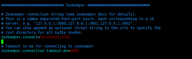 主要修改log.dirs,这个目录用来持久化消息的。最后面有一个zookeeper的配置,这个需要指向刚刚启动的zookeeper