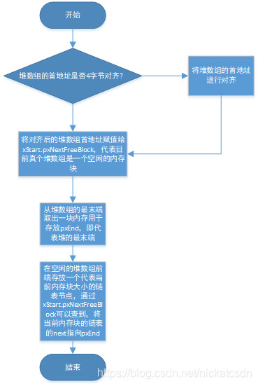 在第一次调用vPortMalloc时,会先调用static void prvHeapInit( void )函数将整个RTOS的堆进行初始化,流程如下: