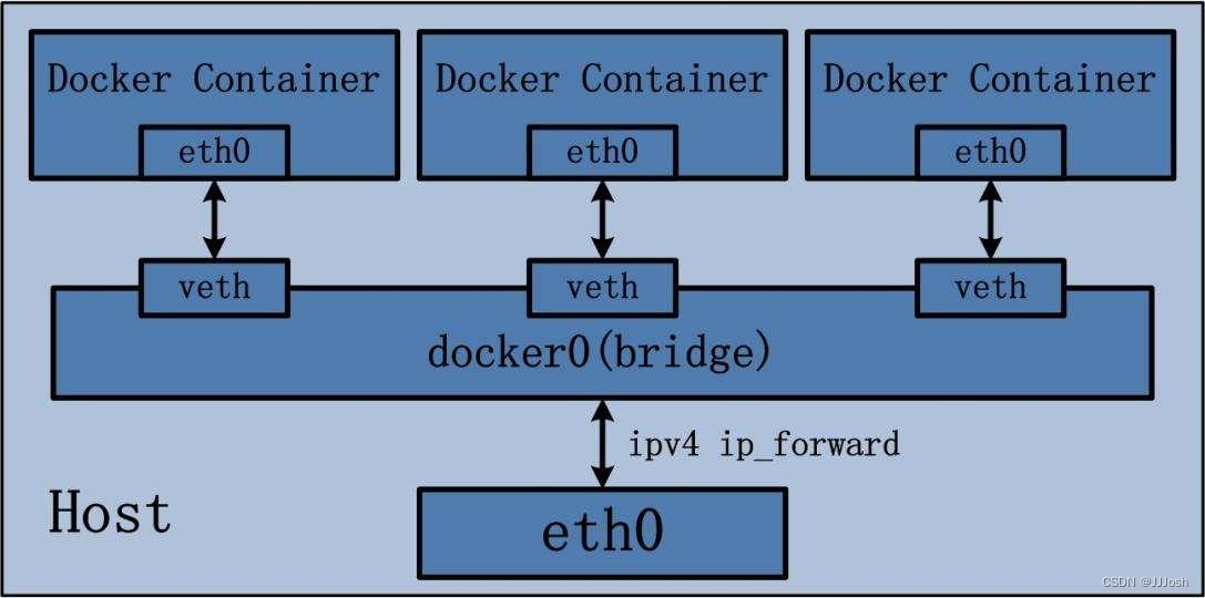 Docker 使用 network namespace 启动一个 vethX 接口,这样你的容器将拥有它自己的桥接 ip 地址,通常是 docker0,而 docker0 实质就是 Linux 的虚拟网桥(网桥是在 OSI 七层模型的数据链路层的网络设备,通过 mac 地址对网络进行划分,并且在不同网络之间传递数据。)