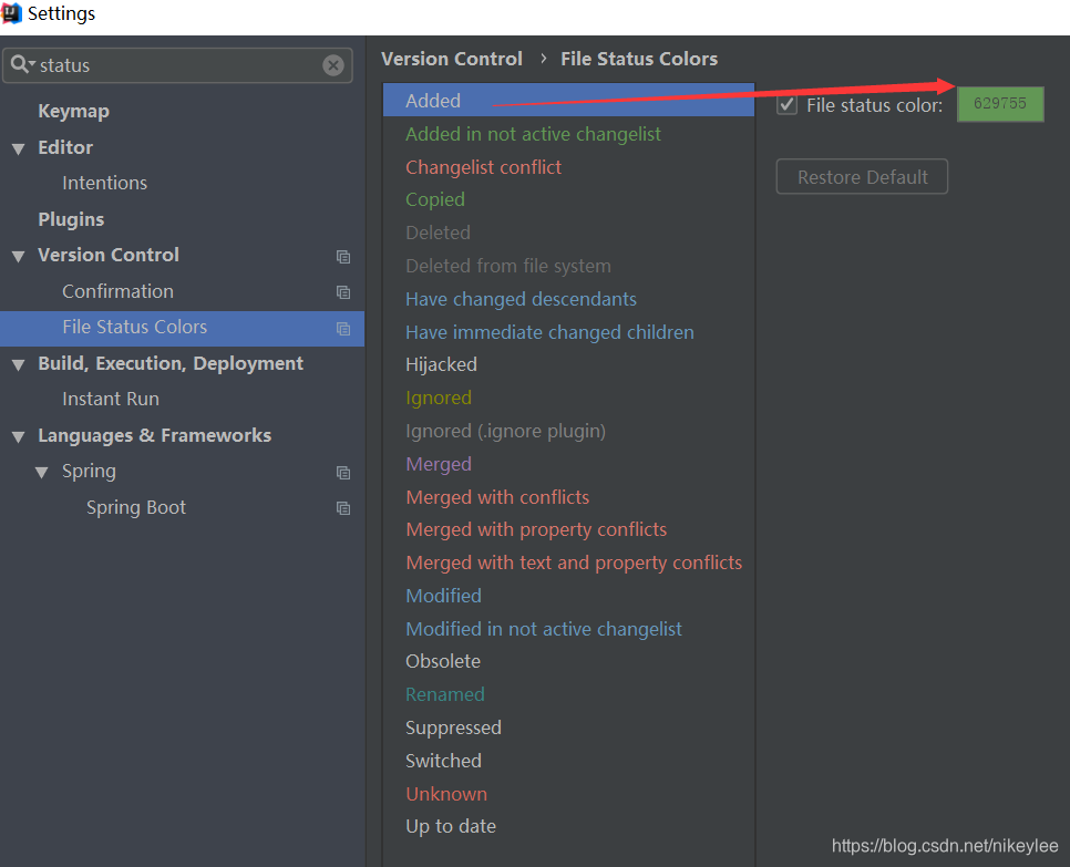 与版本控制工具相关 绿色,已经加入控制,暂未提交红色,未加入版本控制蓝色,加入,已提交,有改动白色,加入,已提交,无改动灰色:版本控制已忽略文件。 文件的颜色,是可以修改的,颜色的意义可自定义设置; 操作位置:File-->Setting-->File Status Colors