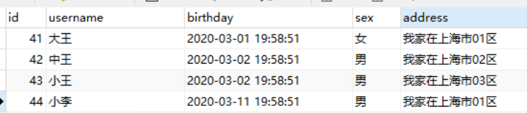 User{id=43, username='小王', birthday='Mon Mar 02 19:58:51 CST 2020', sex='男', address='我家在上海市03区'}