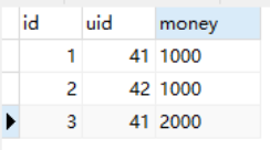 insert into `account`(`id`,`uid`,`money`) values (1,41,1000),(2,42,1000),(3,41,2000);