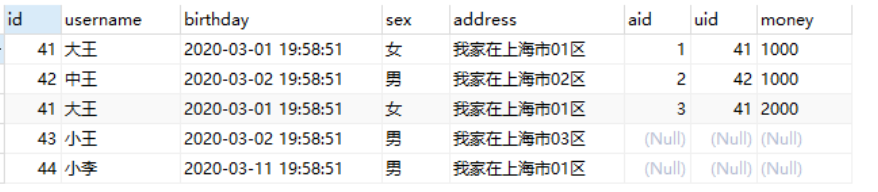 Account{id=3, uid=41, money=2000.0} AccountUser{username='大王', address='我家在上海市01区'}