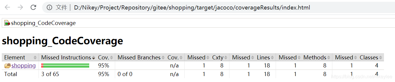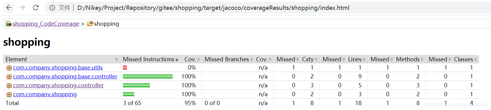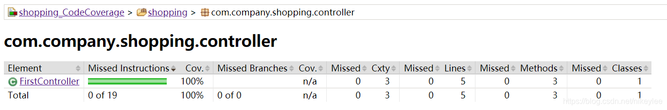 可以看到com.company.shopping.controller包的覆盖率结果,包含了2个测试用例的覆盖结果