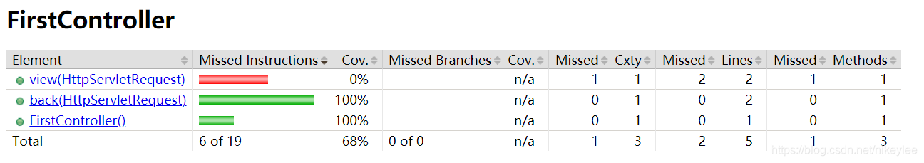 第二栏指令覆盖率和第三栏分支覆盖率,都是进度条的显示形式,红色未覆盖绿色已覆盖,后面跟着覆盖率百分比。