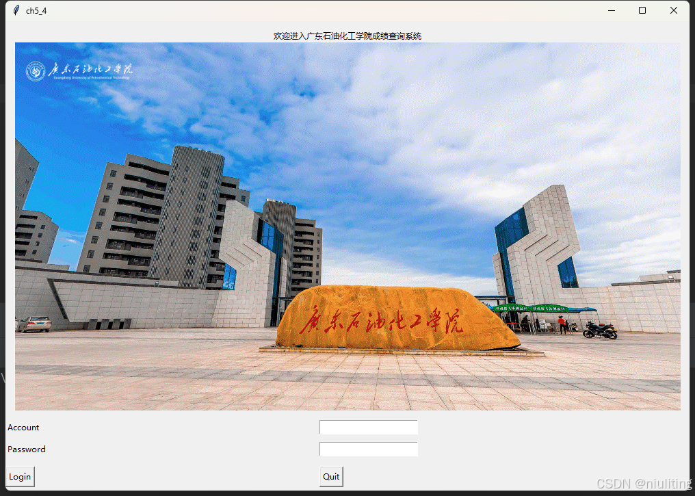 msg="欢迎进入广东石油化工学院成绩查询系统" sseGif=PhotoImage(file="sse1.gif") #Logo图像文件 logo=Label(root, image=sseGif,text=msg,compound=BOTTOM)创建了一个
