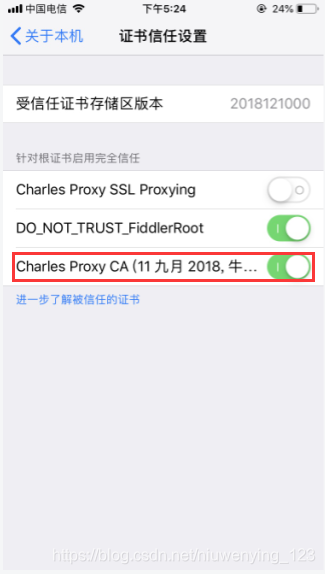 进入【设置】-【通用】-【关于本机】-【证书信任设置】