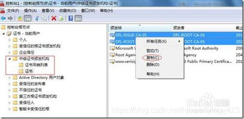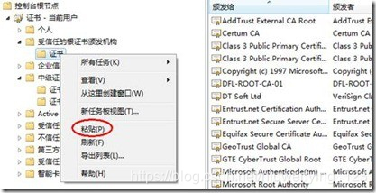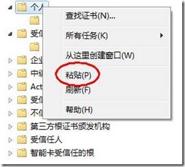 (9)在“受信任的根证书颁发机构—证书”右键粘贴,如下图所示: