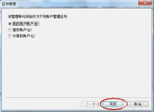 (5)在弹出的窗口上选择“我的用户帐户”后点击“完成”,如下图所示: