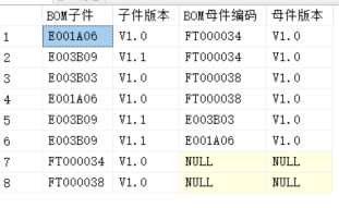 首先对源数据表格式进行一个整理,使之符合普通的递归查询格式,将BOM母件编码放到子件列,方便后面的查询,sql如下所示: