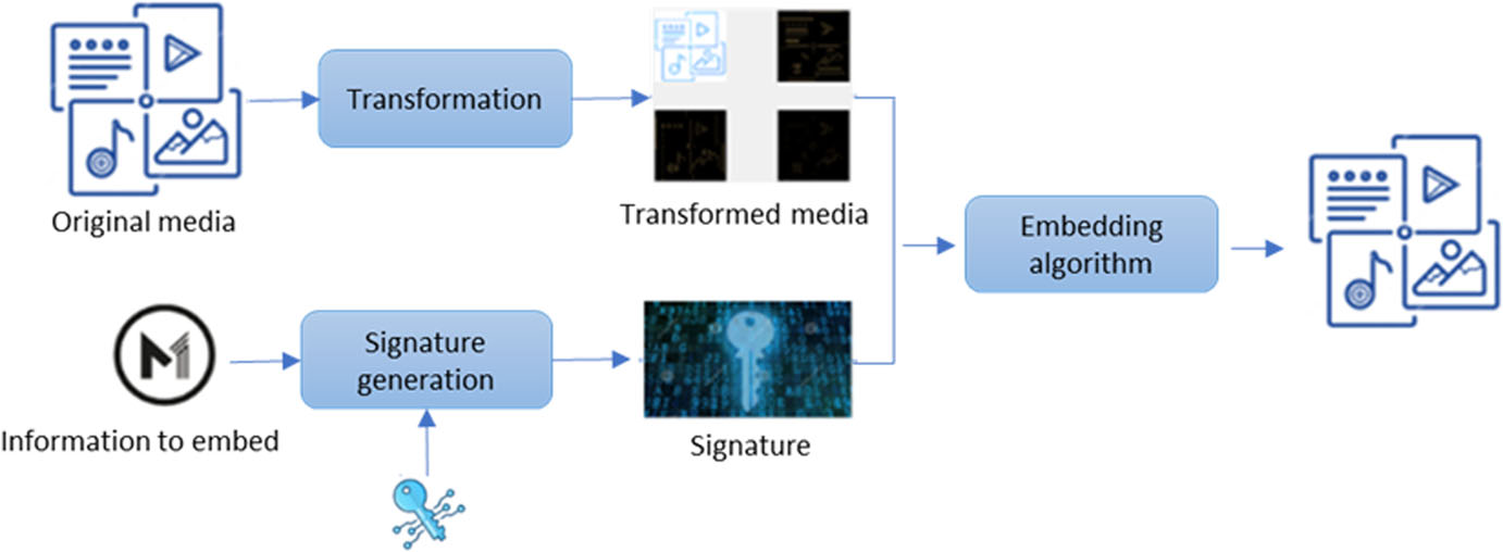 水印过程包括两个主要阶段:签名嵌入和签名检测。嵌入是将包含作者信息或版权信息的签名通过特定嵌入方法嵌入到托管多媒体内容中的阶段,如图2所示。首先,根据选择的嵌入目标(DWT、DCT、FFT等),托管内容(图像、视频或3D模型)最终被转换。然后,通过使用密钥随机置乱水印信息来生成签名,以增强嵌入方法的安全性。水印也可以通过应用多种加密算法来生成,如[14, 19, 53, 69]中提出的。获得的标记嵌入到选定的系数中,然后将这些系数带回原始域以获得标记内容。