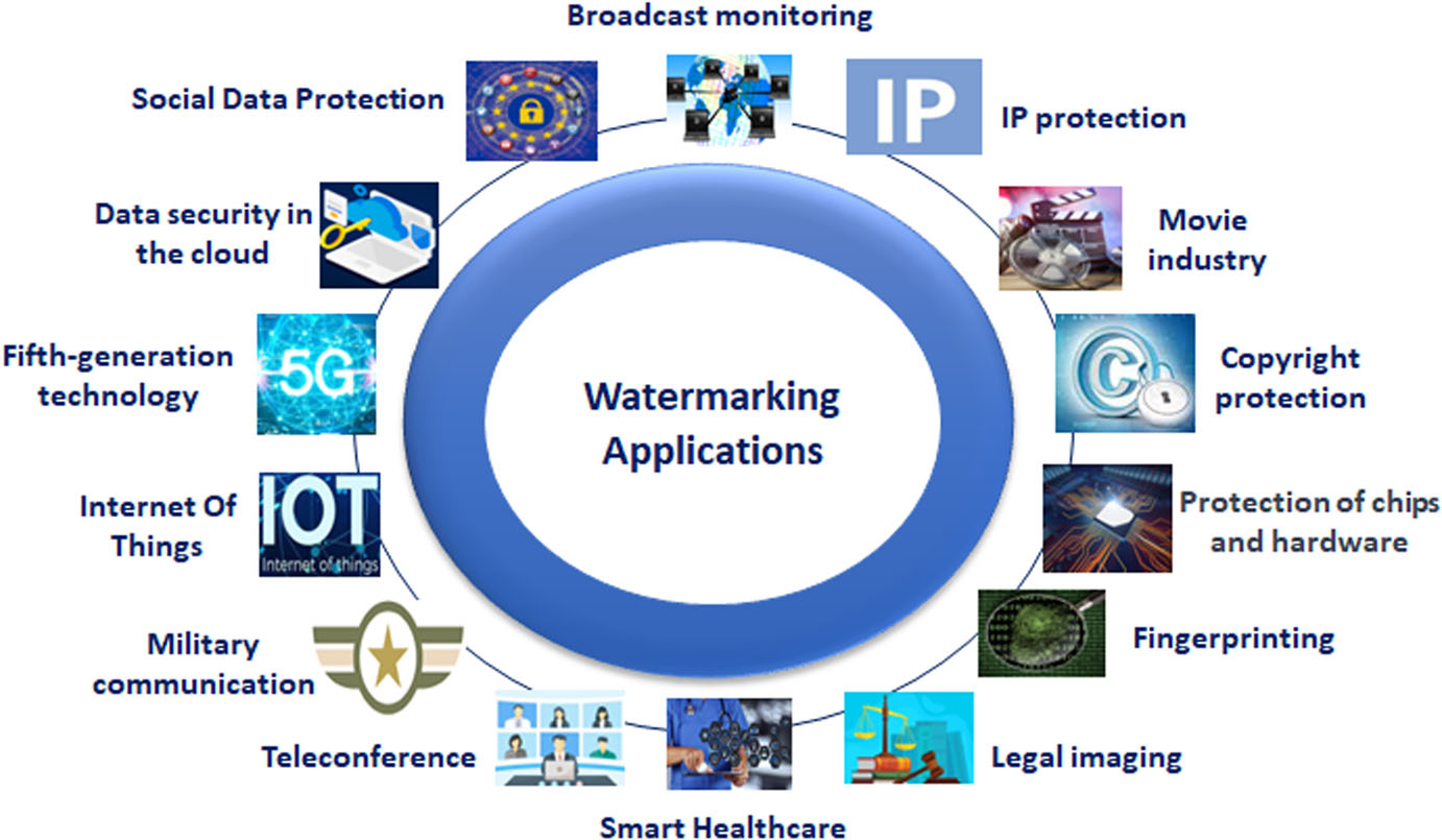 水印是数据隐藏技术的一个分支,它将信息隐藏在数字内容中以在网络中安全传输。信息隐藏技术主要包括隐写术、隐蔽通信和水印。这种技术保护数字内容免受多种安全问题的影响,如非法数据分发、使用、复制、操作和存储。实际上,它将签名嵌入到原始内容中,然后在对标记内容应用不同操作后尝试检测它。通常,鲁棒水印技术应该是不可见的。水印是一个重要的研究领域,这要归功于它在多种媒体应用中的使用,如版权保护和所有者识别、复制控制和指纹识别、内容认证和完整性验证、广播监控、索引和医疗应用。