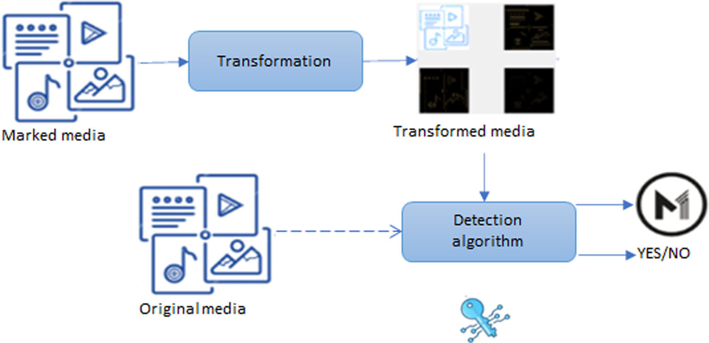 签名检测阶段尝试提取嵌入的水印,通常分解为与嵌入阶段相同的步骤,如图3所示。给定标记媒体,将应用嵌入时使用的相同变换,检测算法将应用于获得的系数。签名检测阶段可能需要原始内容的知识。在这种情况下,我们说水印算法是非盲的。相反,如果在不依赖原始媒体和标记媒体之间比较的情况下恢复水印,则水印算法是盲的。