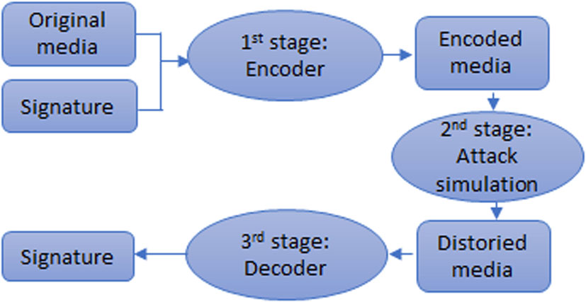 基于深度学习的水印方案分解为三个主要阶段,如图5所示。第一阶段是将签名嵌入原始内容的编码器。第二阶段是攻击模拟,最后使用解码器网络阶段提取签名。由于迭代学习过程,嵌入对第二阶段期间应用的攻击更具鲁棒性,提取网络提高了提取签名的完整性。基于深度学习的水印相对于传统水印的主要优势是它可以轻松地为各种应用和不同攻击重新训练,而不是从头开始设计。