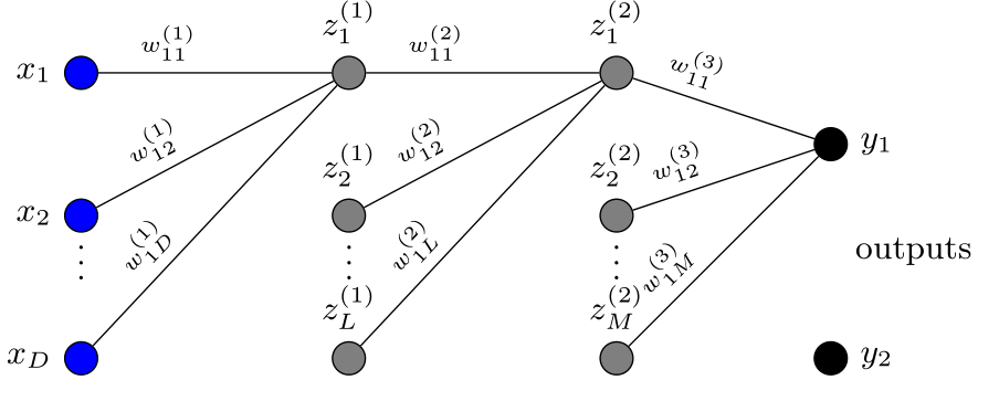 [图2:MLP架构。为了清晰,图表显示了少数单元的连接。每层完全连接,具有ReLU激活。输入维度D = h1 × w1。第一层和第二层中的隐藏单元数分别标记为L和M。]