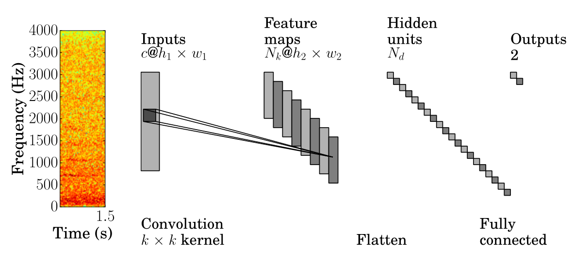 [图1:CNN管道。1.5秒蚊子记录的小波频谱图被分割成具有c=1通道、尺寸为h1×w1的图像。这作为输入到具有Nk个滤波器的卷积网络,核Wp ∈ R^k×k。特征图在卷积后形成,尺寸减少到h2×w2。这些图被完全连接到密集层中的Nd个单元,完全连接到输出层中的2个单元。]