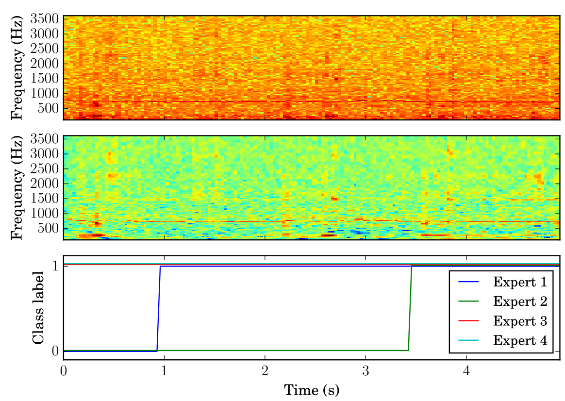 内的分类:缺席,四个个别人类专家标记的蚊子存在。其中,一个特别准确的标签集被作为金标准参考来训练算法和与其余专家进行基准测试。结果标签率给定为