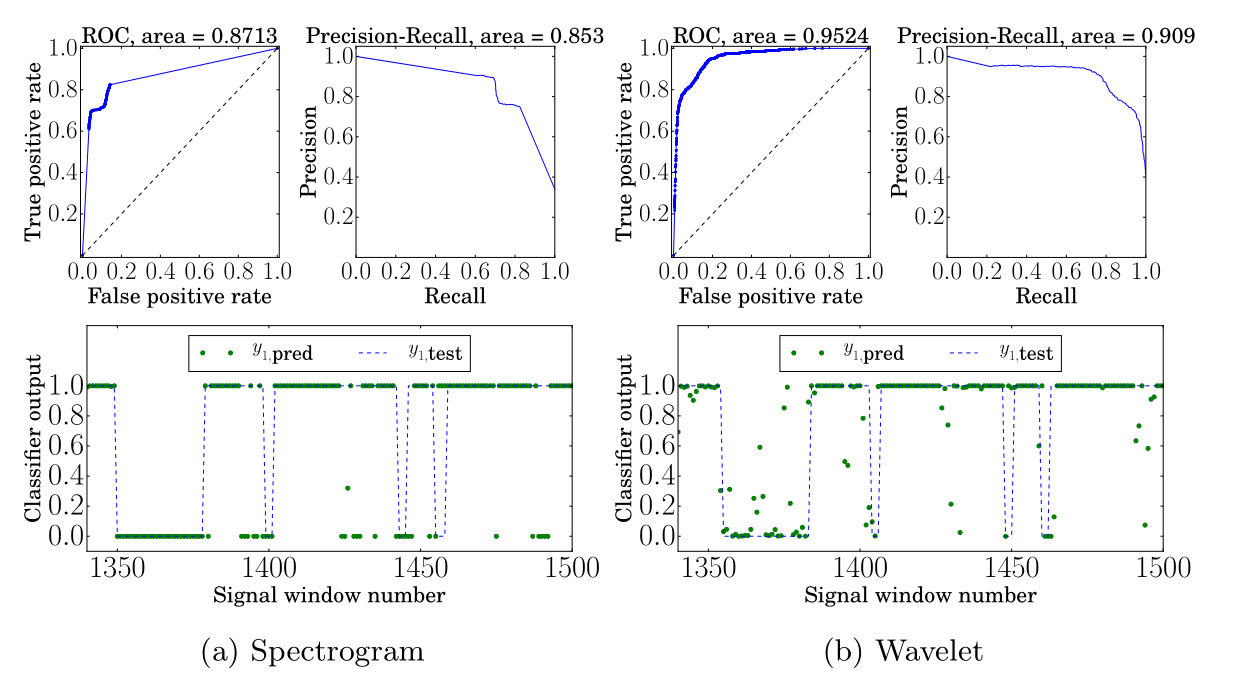 [图4:测试数据上的ROC、精确率-召回率和分类器输出,用于4a:具有256个傅里叶系数的频谱图和4b:具有256个尺度的小波。信号窗口范围的目标预测由蓝色虚线给出,实际预测由绿色点表示。每个预测在w1 = 10样本上生成——320毫秒的窗口。]