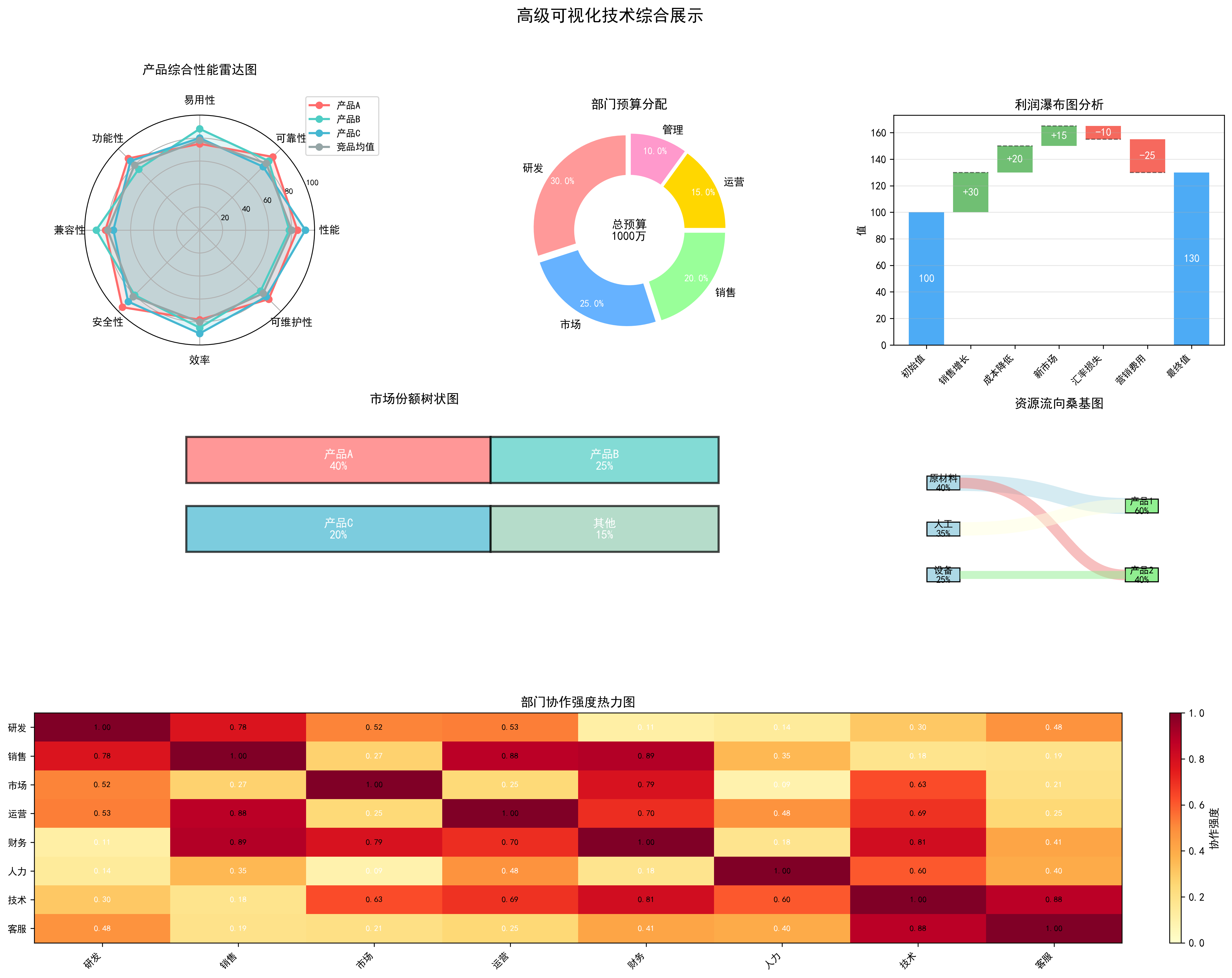 plt.suptitle('高级可视化技术综合展示', fontsize=16, fontweight='bold', y=0.98)