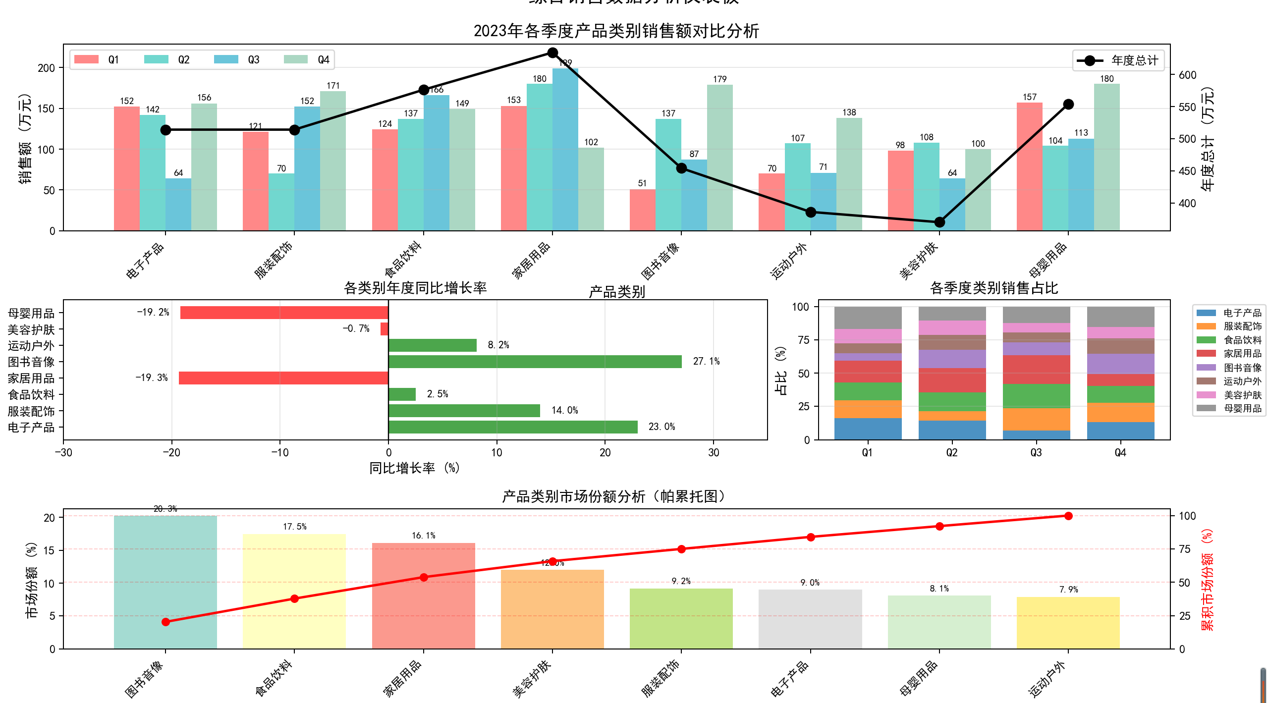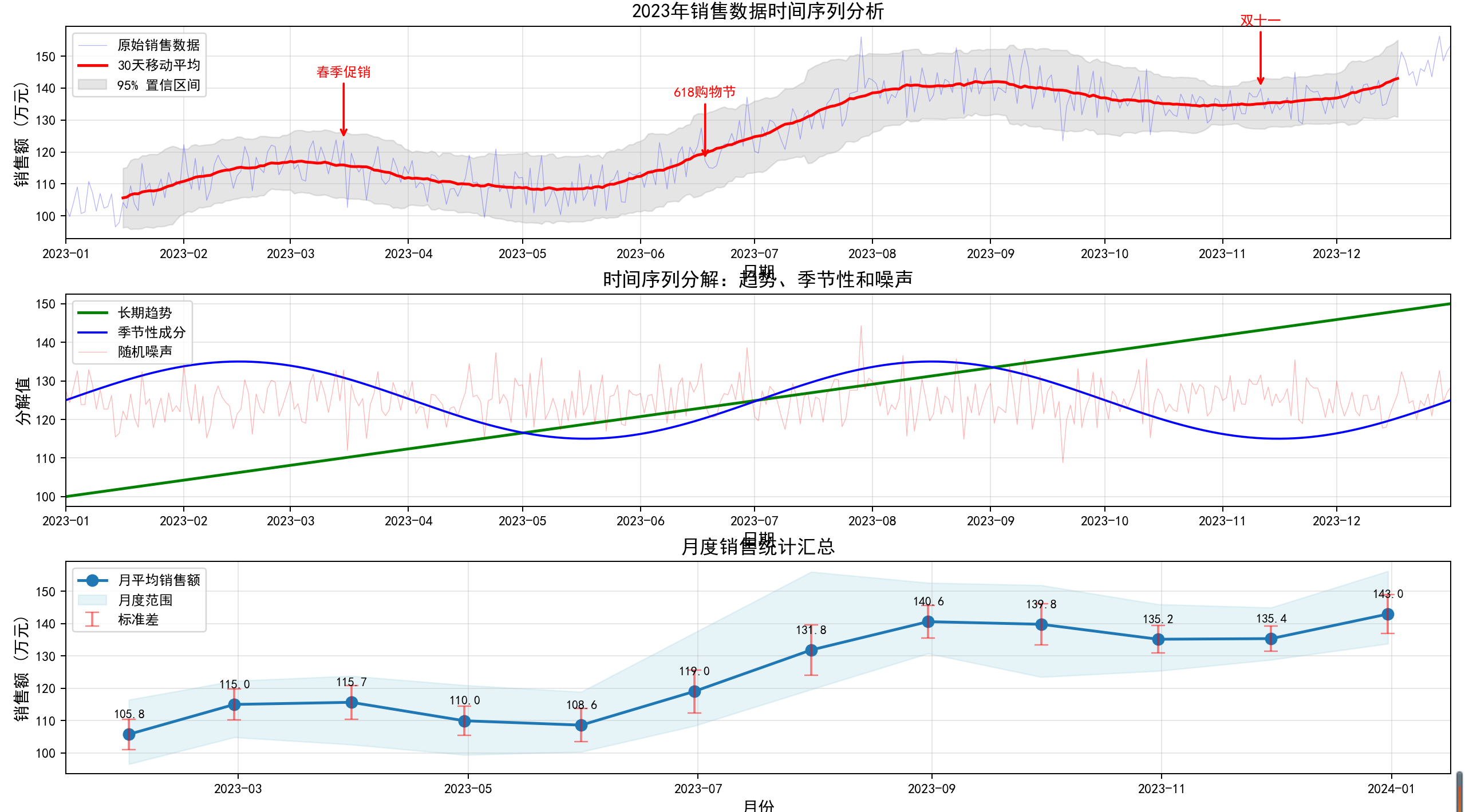 ax1.set_title('2023年销售数据时间序列分析', fontsize=14, fontweight='bold')