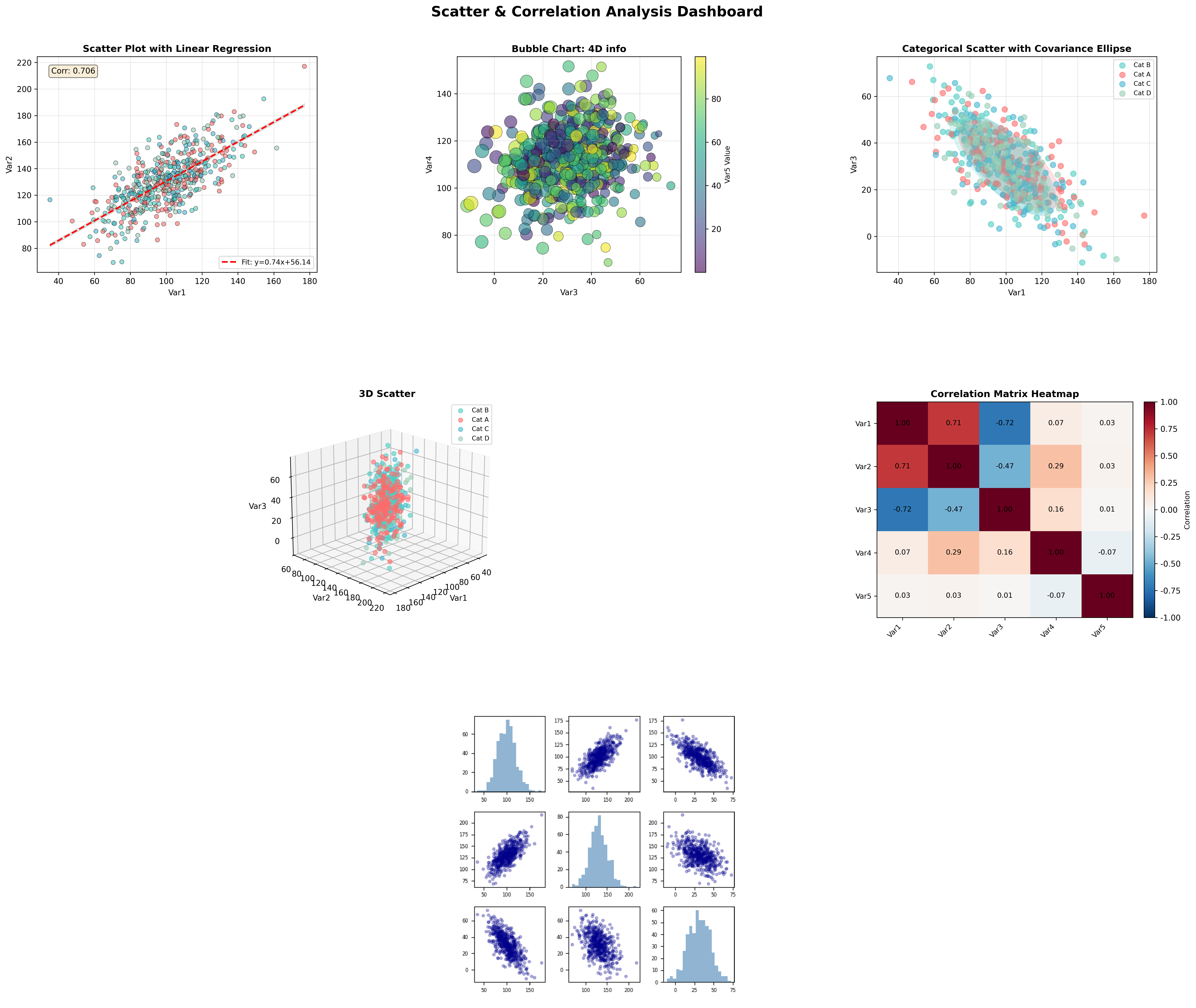 Matplotlib提供了丰富多样的图表类型,每种图表都有其特定的应用场景和最佳实践。在数据可视化的过程中,选择合适的图表类型对于有效传达信息至关重要。折线图适合展示时间序列数据的趋势变化;柱状图适合比较不同类别的数值大小;散点图适合展示变量之间的相关性;直方图适合展示数据的分布情况;饼图适合展示各部分占整体的比例关系。除了这些基础图表,Matplotlib还支持箱线图、小提琴图、等高线图、3D图表等高级图表类型,每种图表都有其独特的表现力和应用价值。