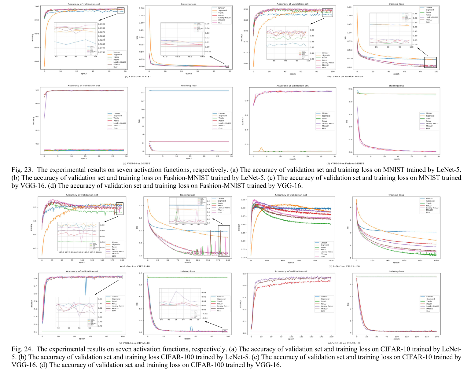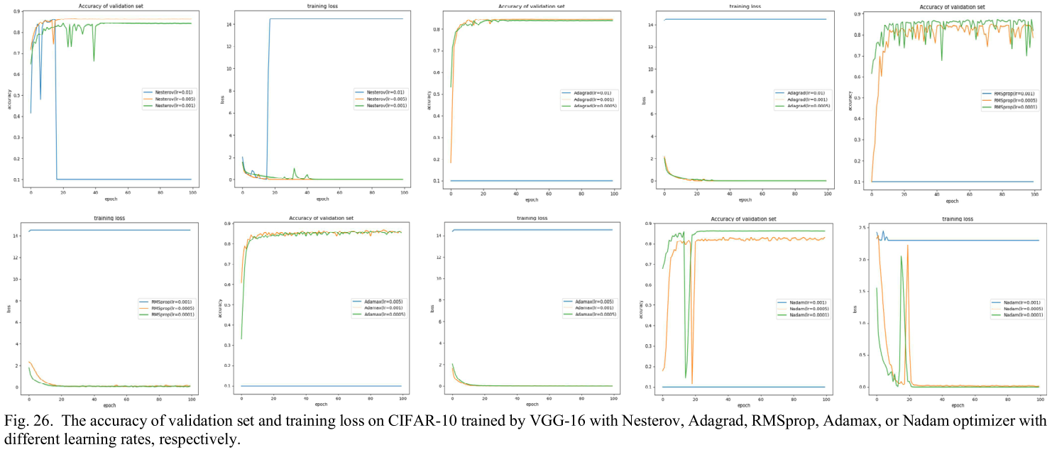 为了全面评估CNN的各个组件,本文设计了系统性的实验来比较不同激活函数、损失函数和优化器的性能。实验使用了多个标准数据集,包括MNIST、Fashion-MNIST、CIFAR-10和CIFAR-100,并在不同复杂度的网络(LeNet-5和VGG-16)上进行测试。