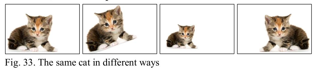 CNN对图像的轻微变化不敏感,如旋转、缩放和对称,这已被Azulay等人证明。然而,当用图33(a)训练时,CNN无法正确识别图33(b)、(c)或(d)与前者是同一只猫,这对人类来说是显而易见的。