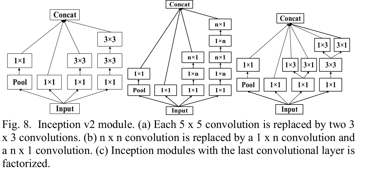 此外,Inception v2展示了单个5×5卷积层可以被两个3×3卷积层替换。一个n×n卷积层可以被一个1×n和一个n×1卷积层替换。然而,原始论文指出在早期层中使用因式分解效果不佳,最好在中等大小的特征图上使用。