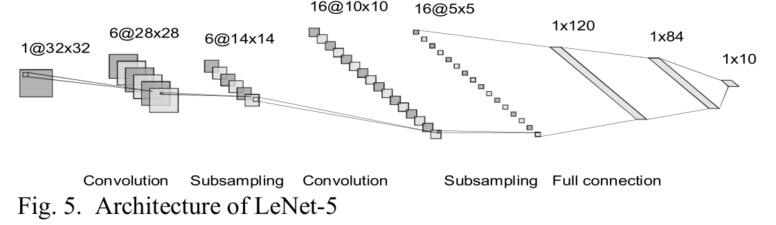LeCun等人在1998年提出了LeNet-5,这是一个用反向传播算法训练的高效卷积神经网络,用于手写字符识别。LeNet-5由七个可训练层组成,包含两个卷积层、两个池化层和三个全连接层。