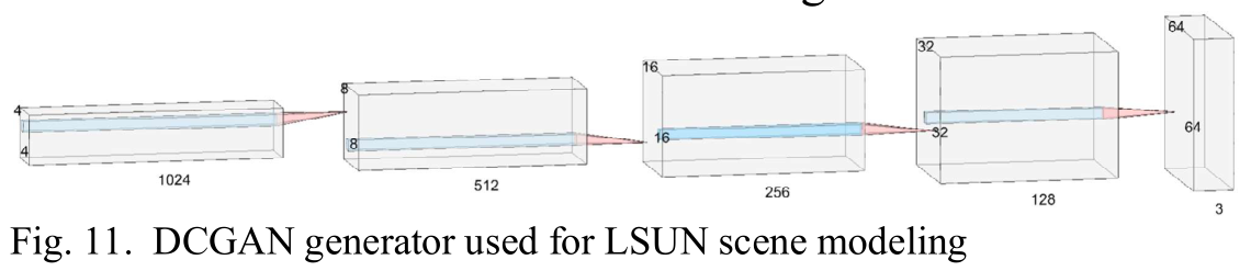 Radford等人在2015年提出了深度卷积生成对抗网络(DCGAN)。DCGAN在大规模场景理解(LSUN)数据集上的生成器通过使用深度卷积神经网络实现。