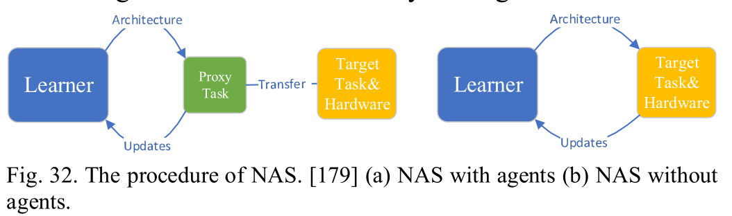 NAS可以分为有代理的NAS和无代理的NAS。由于NAS对计算资源的高需求,集成模型由在小规模数据集中学习的最优卷积层组成。小规模数据集是生成整体模型的代理,因此这种方法是有代理的NAS。无代理的NAS是指直接在大规模数据集上学习整个模型。