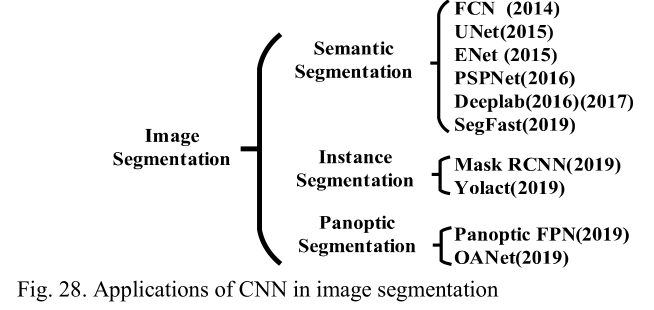 此外,还有一些工作专门综述了CNN在目标检测、图像识别、图像分割等特定应用中的作用。这些综述主要关注CNN在不同场景下的应用,而没有从通用角度考虑CNN。同时,由于CNN的快速发展,该领域提出了许多启发性的想法,但这些综述并未完全涵盖。