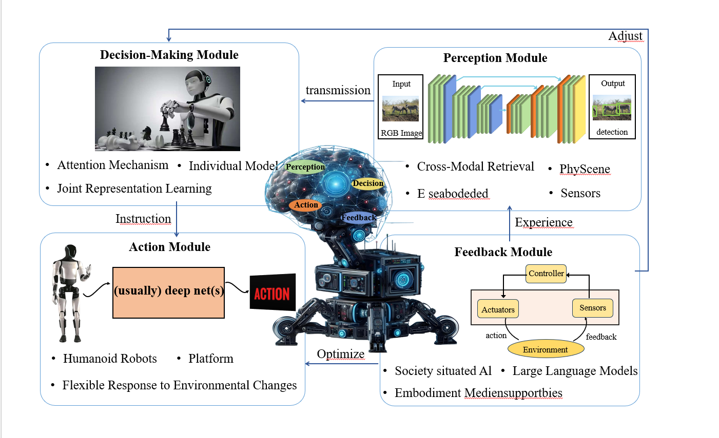 Jiang 等人把具身智能系统拆解为四个核心模块:感知模块、决策模块、行动模块、反馈模块,认为这四者构成了一个高度耦合的闭环结构,共同决定系统能否实现 AGI 所需的通用性与适应性。(arXiv)