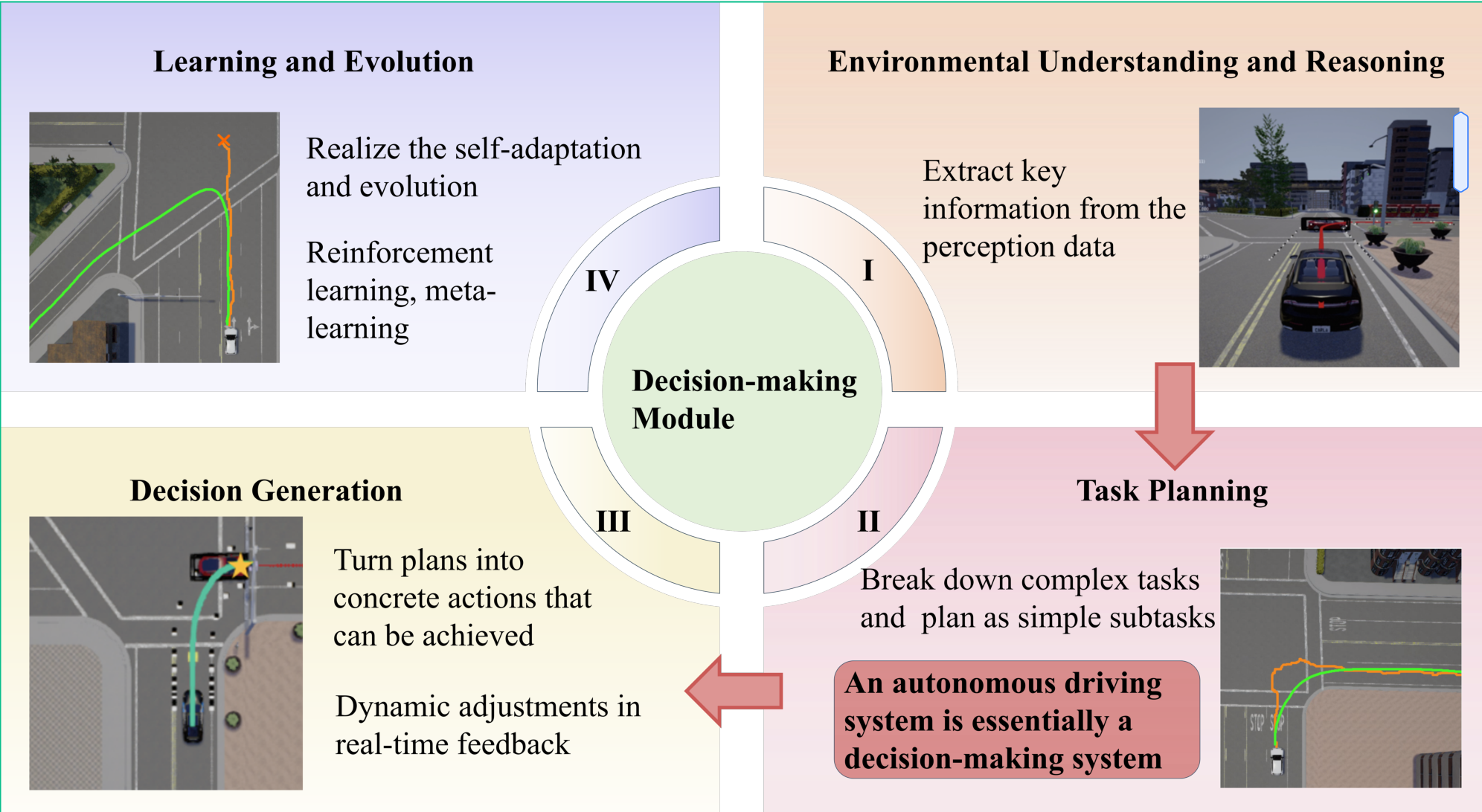 决策模块细分为四个子功能:环境理解与推理、任务规划、决策生成、学习与进化框架,并在 Fig.4 和 Fig.5 中分别展示了静态结构与动态学习过程。(arXiv)