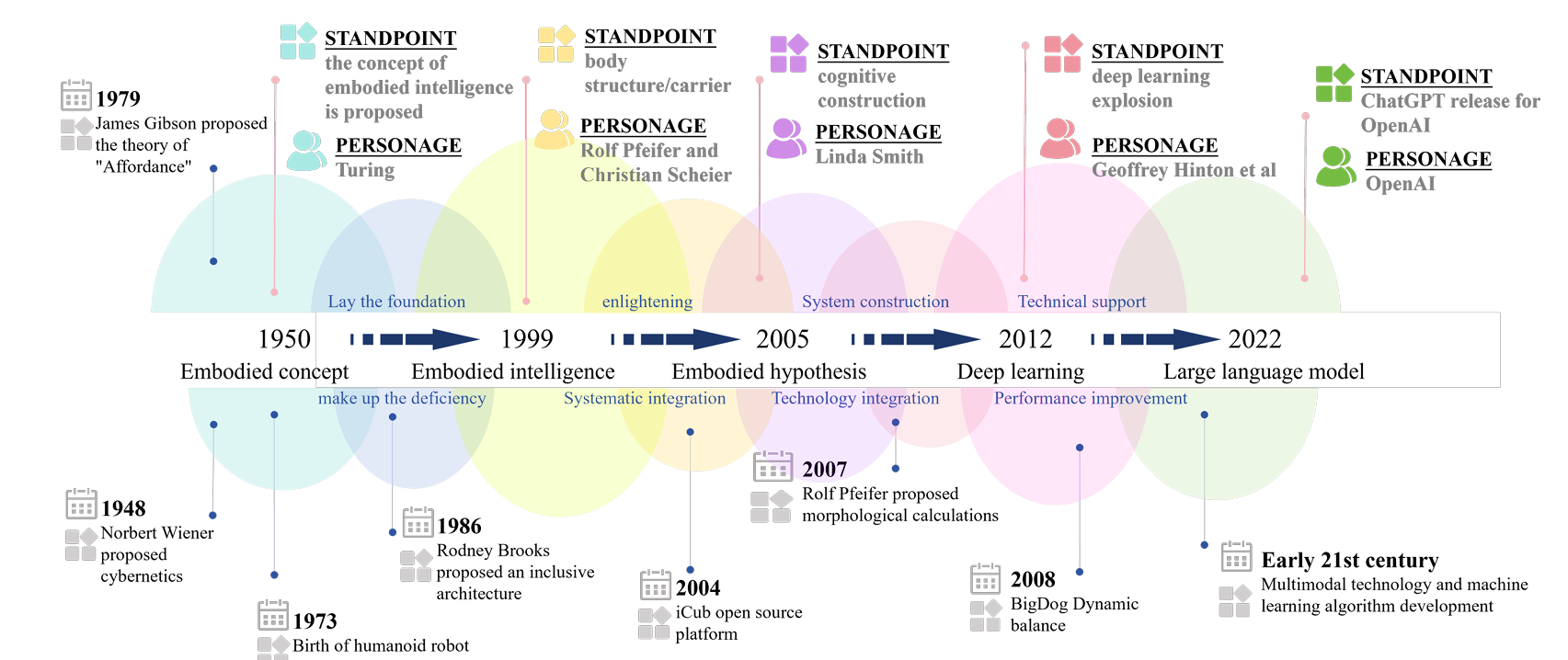 Jiang 等人回顾了具身智能的理论源流,核心线索可以简单概括为:从“大脑中心主义”走向“身体—环境—认知一体化”。早在 1948 年,图灵在《Intelligent Machinery》中就隐约提出,真正的机器智能不能仅靠抽象计算获得,而应通过某种形式的“物理实践”逐步发展出来。这一想法在后来 Rodney Brooks 的“行为型机器人”和“分层抑制架构”中被具体化,Brooks 反对为机器人构建笼统的世界模型,而是强调通过与环境的直接交互形成逐层的行为模块。(arXiv)