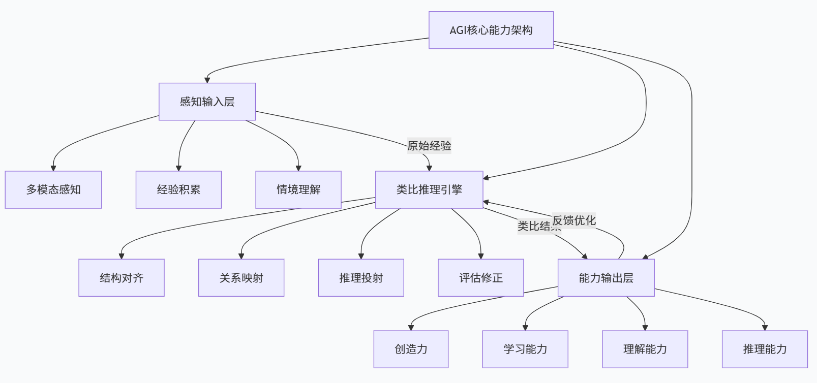 | 本文立场 | 采用能力视角,避免整体智力刻度 | 强调以“能力结构”代替“整体聪明度” | 接受人机智能多样实现,但强调共享能力为比较基础 | 为“类比作为核心能力”铺路,把 AGI 看作围绕类比引擎组织起来的多能力系统 |