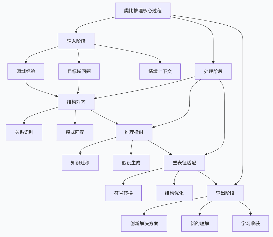 | 溯因推理 | 猫躲床底、选择“噪音”作为最佳解释 | 在多种备选解释中选择最合理者 | 把当前情境分别与不同类型过往经验对齐,比较各类比的结构契合度和频率,以确定最佳解释 |