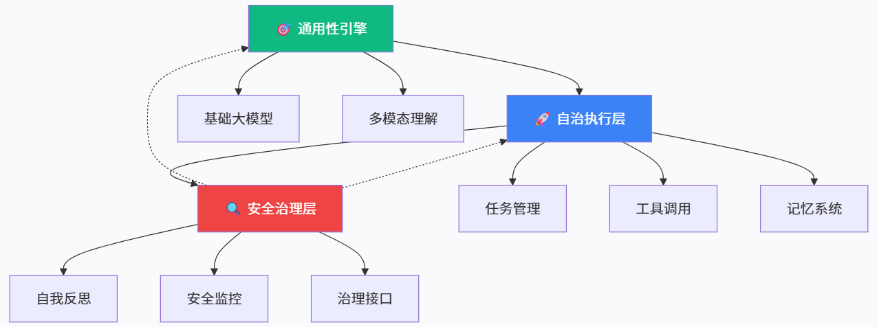 | 长期自主演化层 | 在开放环境中持续设定目标、反思与进化,具备长期记忆与自我模型(仍在探索中) | 研究性原型与理论工作,尚无成熟开源工业系统 |