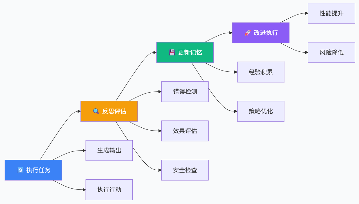 在典型的 Agent 循环中,自我反思可以以多种形式出现。最简单的形式是对失败案例进行反思:当智能体某次尝试未能完成任务时,它将失败原因口头化,例如“我误解了题目中变量的含义”或“我调用的 API 返回格式与预期不符”,然后将这些反思写入长期记忆,供下一轮尝试参考。更复杂的设计则会在每一轮成功或失败后都进行反思,从而让智能体在“成功经验与失败教训的混合记忆”中不断更新“策略偏好”。