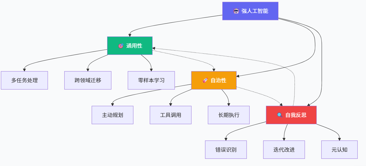 然而,如果只从“参数规模更大”“基准测试得分更高”来理解强人工智能,很容易陷入指标驱动的幻觉。真正具有启发意义的是:在纷乱的技术路线与概念口号之下,强人工智能到底需要哪些本质能力?本文试图站在开源生态与最新研究进展的视角,将“强人工智能”的能力需求抽象为三大核心:通用性(Generality)、自治性(Autonomy)与自我反思(Self-Reflection)。这三种能力之间相互依存:没有通用性,智能体难以在多任务环境中迁移经验;缺乏自治性,系统只能停留在“高级工具”而非“主动体”的层级;缺少自我反思能力,智能体就难以在长期交互中纠正偏差、积累元经验,从而跨越“看似聪明”的统计模式,走向真正稳健、可靠并可持续演化的智能。