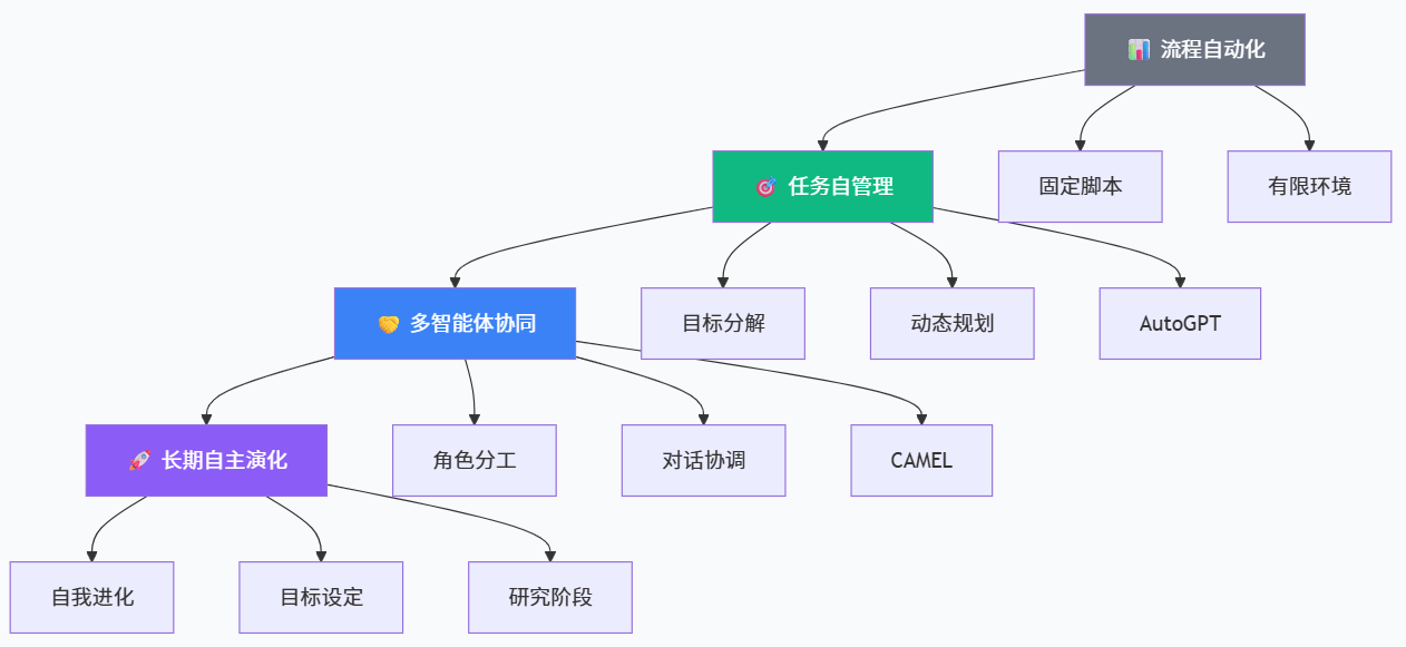 这一层次划分并非严格标准,但可以帮助我们理解:今天我们看到的“自治 Agent 热潮”,更多是位于任务自管理层与多智能体协同层,其自治性仍然受到工具调用能力、记忆设计、以及对人类安全约束的多重限制。真正达到“长期自主演化”的系统还主要存在于理论探索与小规模实验中。