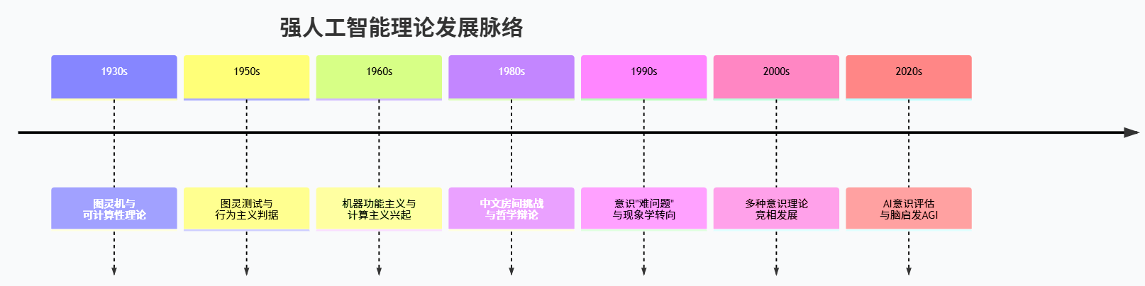 在这种背景下,如果只是把 AGI 理解为“参数更大、推理更强”的模型,很容易忽略其身后的理论深水区。本文试图以“强人工智能的理论基石”为主线,从图灵机与可计算性出发,依次回顾图灵测试与强 AI 设想、计算主义与机器功能主义、中文房间与强 AI 之争,继而引出意识的“难问题”与当代理论,对接最新的 AI 意识研究与开源 AGI 综述,希望勾勒出一幅从“能算什么”到“能感受什么”的长距离思想地图。