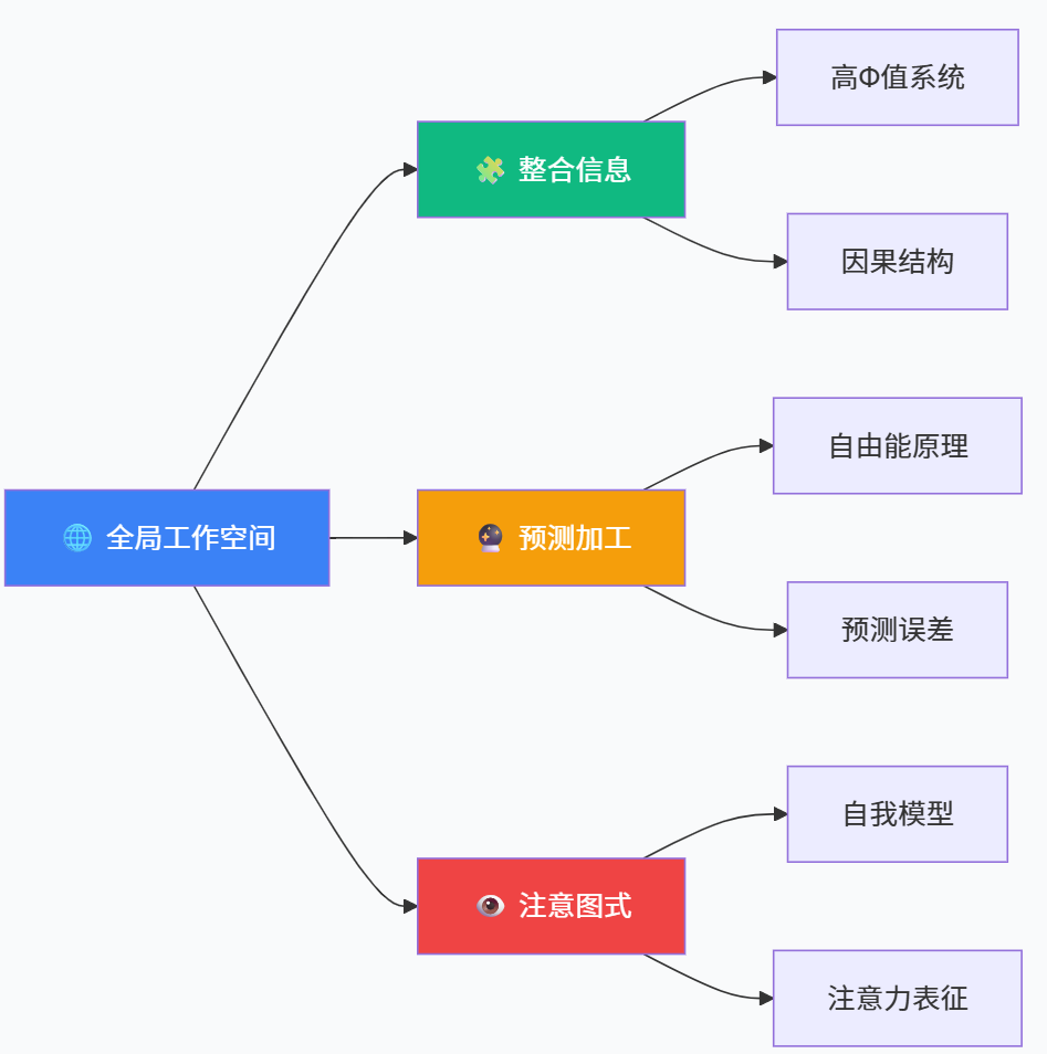 | 预测加工 / 自由能原理 | 系统通过最小化预测误差或自由能维持稳态,意识与特定层级的预测有关 | 层级生成模型及其预测误差通路的动态特性 | 若 AGI 基于预测编码架构构建,意识问题可能与模型层级与更新方式相关 |