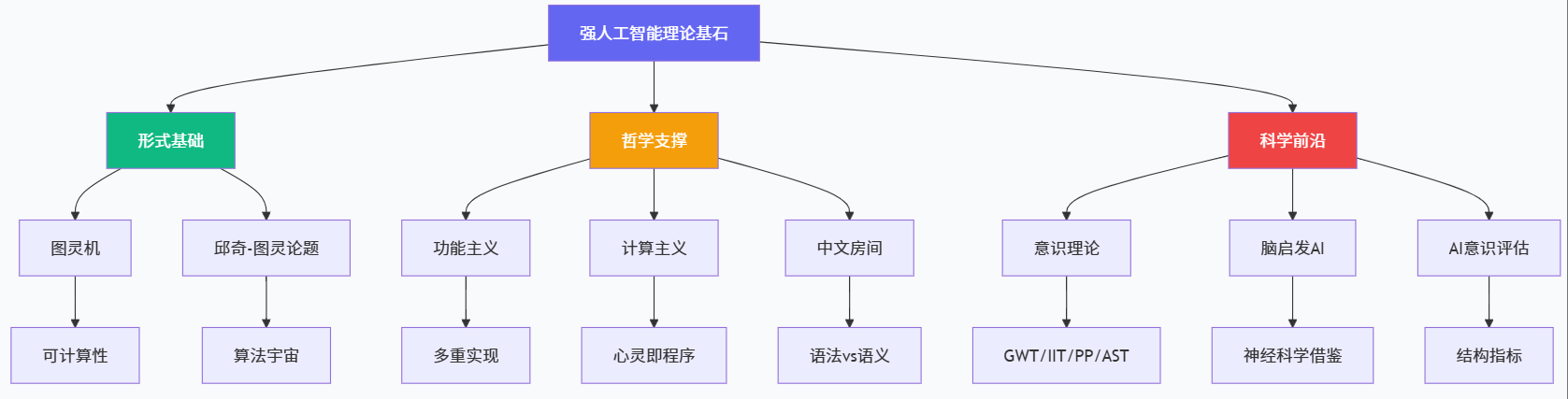 如果把强人工智能的理论基础压缩成一幅结构图,大致可以分为三个互相关联但又各有侧重的层级。底层是形式计算层,以图灵机、λ 演算和递归函数理论为代表,回答“什么可以被计算”;中间是认知架构层,以计算主义、功能主义以及各种认知模型(如全局工作空间、预测加工)为代表,回答“什么样的计算结构可以实现心智功能”;顶层是现象体验层,以意识的“难问题”和各种意识理论为代表,回答“为什么这些结构会伴随主观体验”。