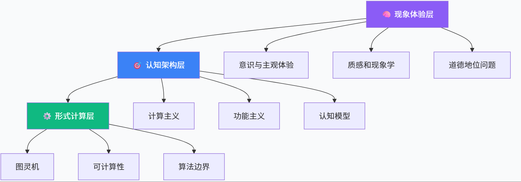 这三层之间的关系并不是简单的推导关系,而更像是一种“解释向上、约束向下”的交织:形式计算为认知架构提供表达语言和理论边界;认知架构在形式上必须可计算,但又需要符合神经和行为数据;现象体验层则要求任何关于意识的理论不仅在行为与神经层面自洽,还要能解释主观经验的结构特征。