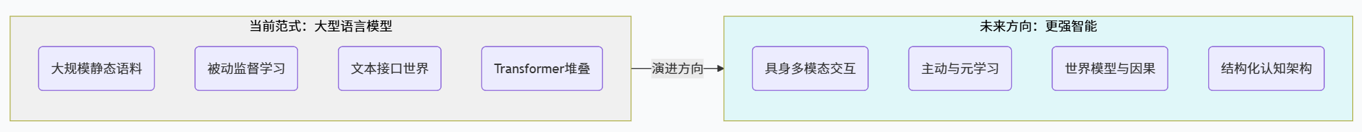 | 任务通用性与世界覆盖 | 文本世界内高度通用,对物理世界、具身互动和多文化世界理解非常有限 | 在语言、感知、行动、社交等多模态和多文化环境下表现出稳定的通用智能 |