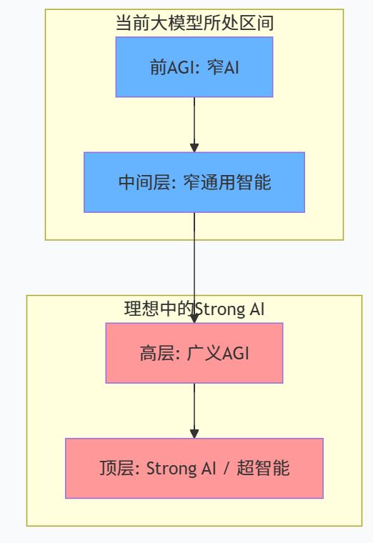 在这套框架中,真正意义上的 AGI 和 Strong AI 通常被放在最高的几个等级:既能在大量任务中达到人类专家甚至超人表现,又能在长期、开放环境中表现出高自治、可对齐和可靠的行为。相比之下,现有大模型大多被归入“前 AGI 阶段”或“窄通用智能阶段”,也就是在若干类别的任务上表现接近人类,但在能力广度、自主性和稳健性上仍有巨大差距(AICR Consulting)。